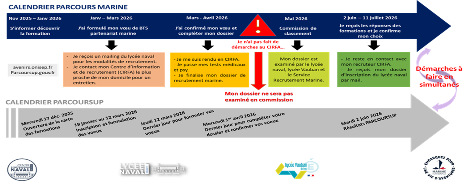 - Prendre rendez-vous auprès du Centre d’Information et de Recrutement des Forces Armées (CIRFA) le plus proche (hotline e-CIRFA : 04 22 43 90 18) pour engager les démarches d’aptitudes médicales et psychologiques et être reconnu apte à l’engagement avant la phase d’admission PARCOURSUP – au plus tard à la validation définitive de leurs vœux PARCOURSUP.